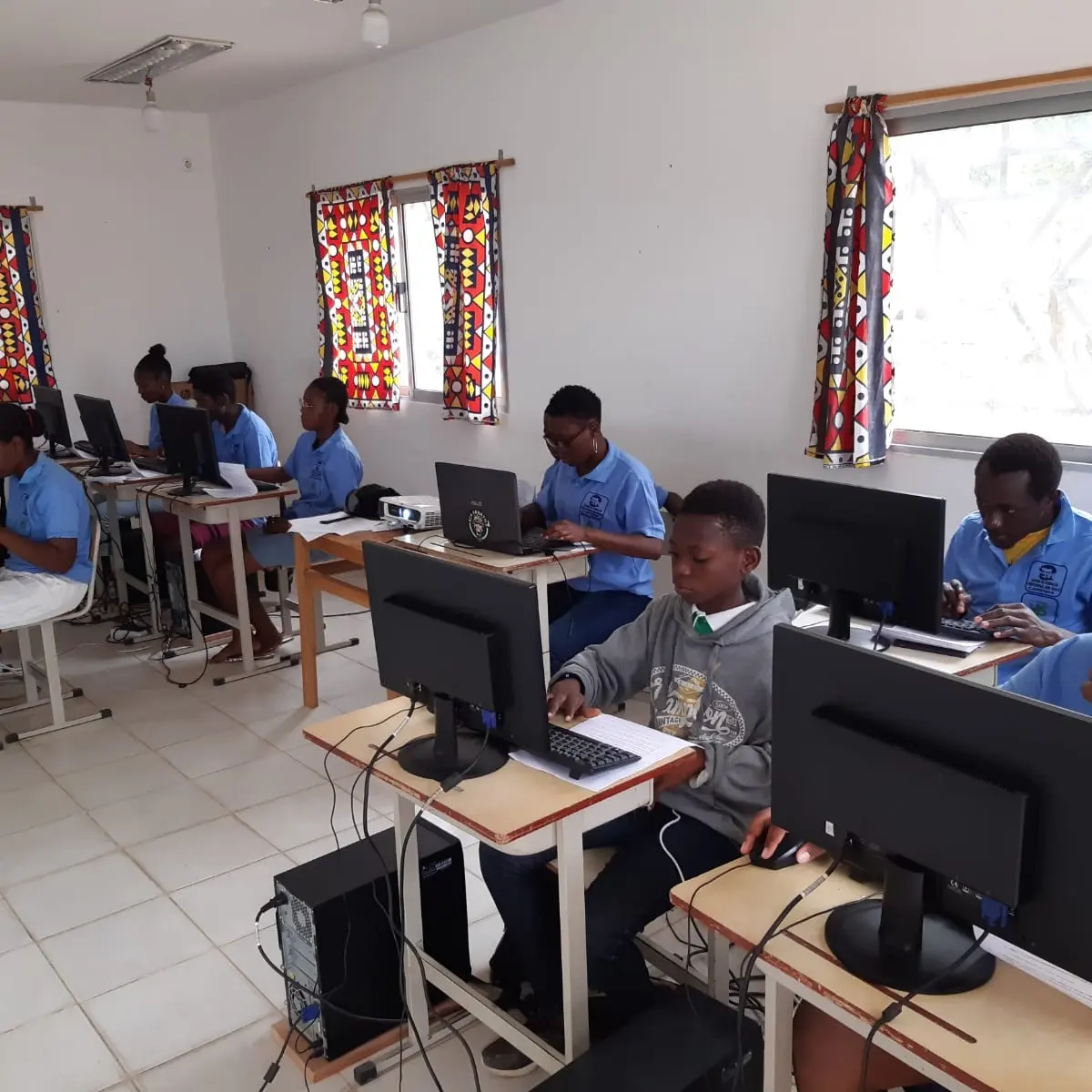 Passou nem uma semana e já escreveu o voluntário Henrique: “Em Cabinda já dei início aos cursos de informática: a escola tem uma sala ótima para o ensino, com um projetor e 10 computadores. Neste momento estamos com 3 turmas e para a semana abre uma nova turma, fazendo um total de 4 turmas e 40 alunos, com aulas de 2a a 6a das 8h as 18h.